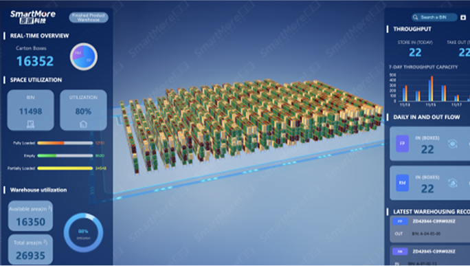 Through SmartMore’s Digital Twin and Business Insight platforms, real-time operational data can be overlaid on a digital representation of a warehouse or manufacturing site. Real-time status and condition of production lines, equipment and product can be monitored and accessed.